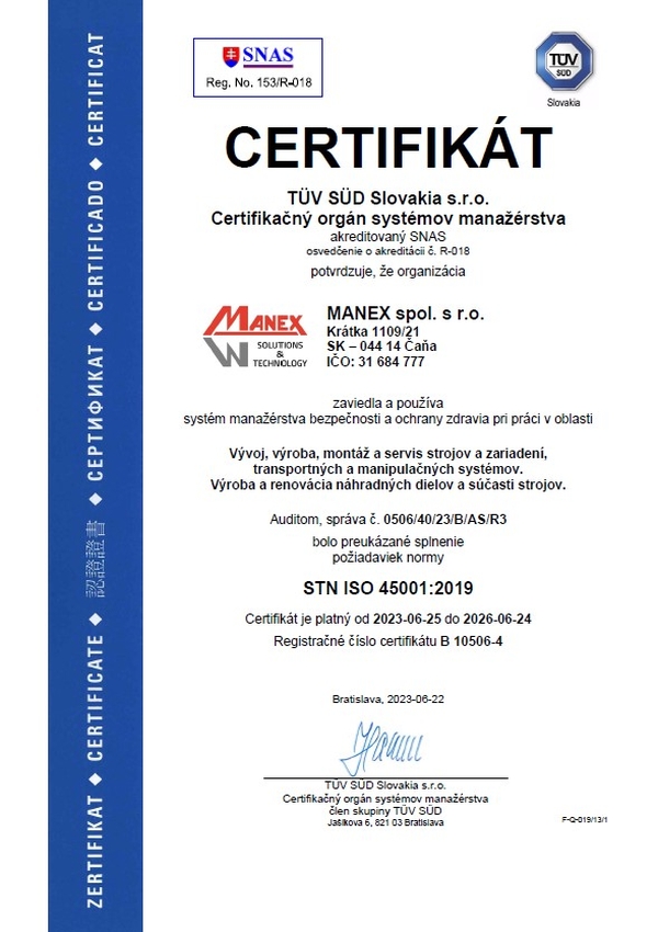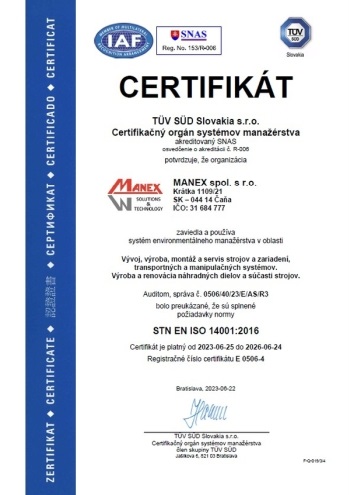 MANEX si je vedomý toho, že všetky jeho činnosti priamo vplývajú na životné prostredie a na celú spoločnosť. Preto sme sa v roku 2014 rozhodli zaviesť Systém environmentálneho manažérstva - certifikát ISO 14001:2005.