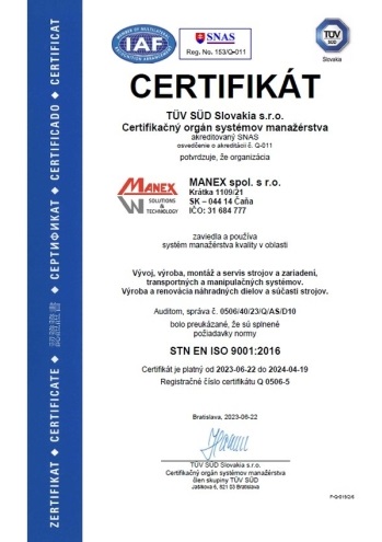 V roku 2009 sa spoločnosť MANEX stala držiteľom certifikátu ISO 9001:2009 a tento Systém manažérstva kvality používa v oblasti výroby, montáže aj servisu. Pre naplnenie cieľa vyrábať na Slovensku "Švédsku" kvalitu spoločnosť vypracovala interný systém výroby a dodržiavania kvality, systém archivácie výrobnej dokumentácie pre prípad opakovanej výroby.